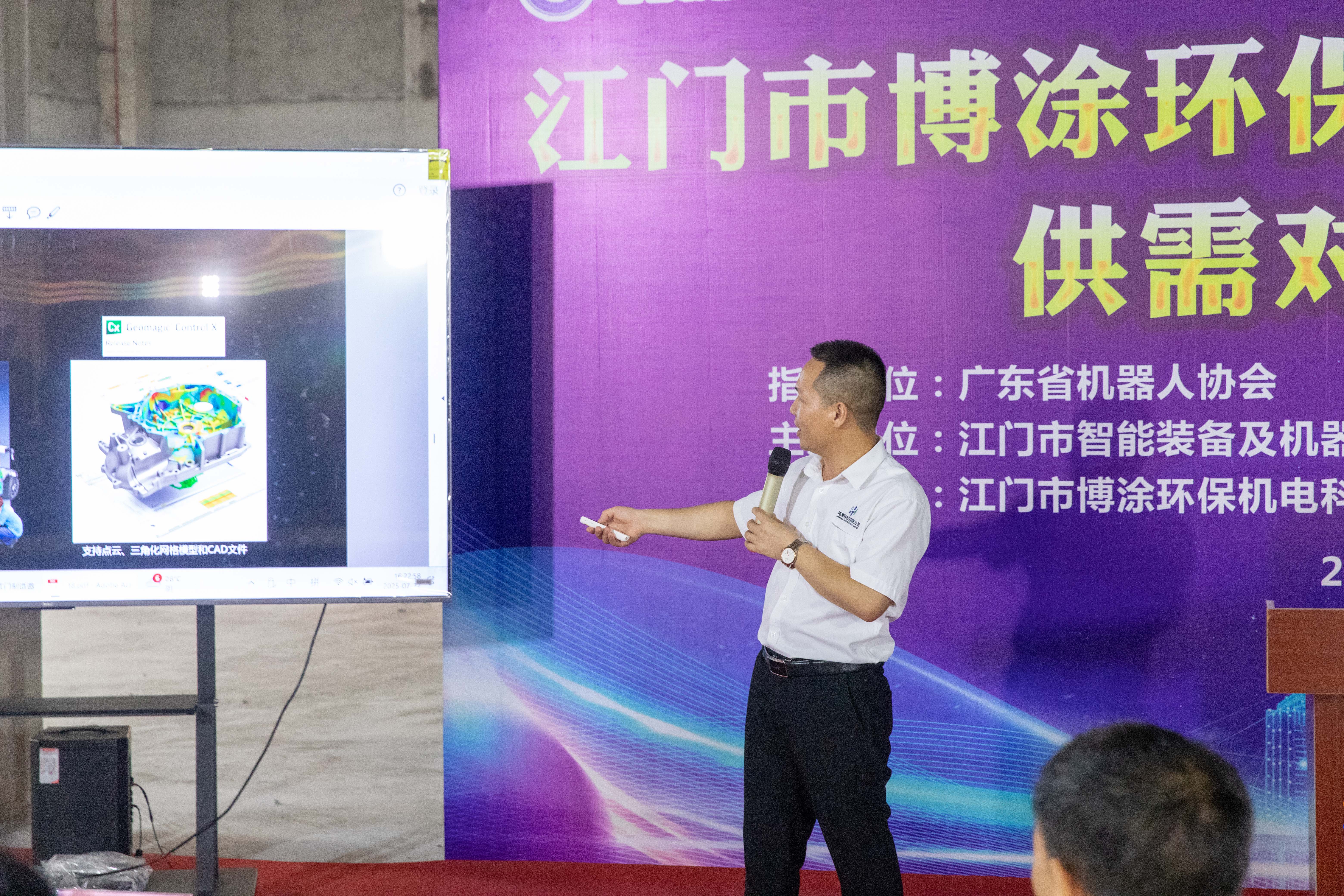 本次交流會精準邀約27家企業(yè)參與,覆蓋智能裝備、機器人、五金配件等多元領域,匯聚行業(yè)智慧與資源,為產業(yè)交流合作注入活力。活動得到廣東省機器人協(xié)會指導支持,由江門市智能裝備及機器人協(xié)會、江門市智能機器人產業(yè)技術創(chuàng)新聯(lián)盟、江門市博涂環(huán)保機電科技有限公司聯(lián)合舉辦。江門市新會區(qū)大澤鎮(zhèn)經濟辦主任徐力超先生、新洲美谷科技工業(yè)園領導任建軍先生、江門市智能裝備及機器人協(xié)會執(zhí)行會長王建生教授、江門市博涂環(huán)保機電有限公司總經理李興華先生等領導出席本次交流會。與會企業(yè)代表先后進行推介,圍繞企業(yè)發(fā)展歷程、產品研發(fā)和生產智造實力等方面展開分享,并在現(xiàn)場展開熱烈交流,共探合作機遇。公司總經理許高云先生上臺推介公司總代理產品-法國科瑞朗公司(Kreon Technologies)關節(jié)臂三坐標測量儀。